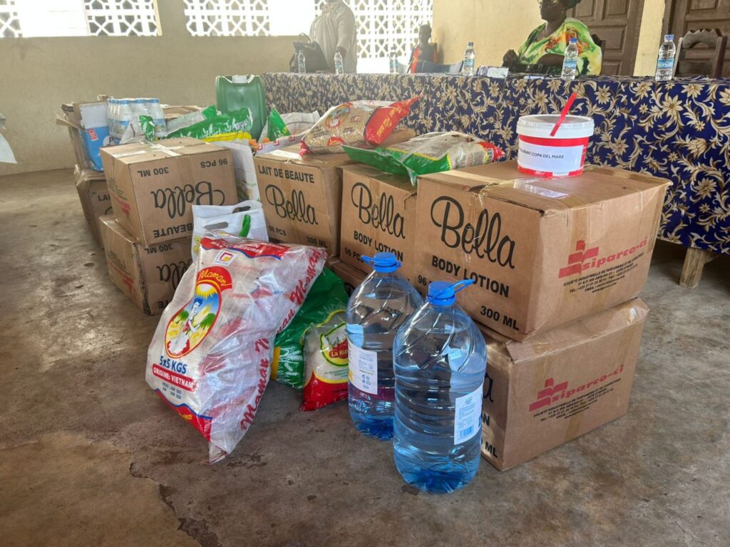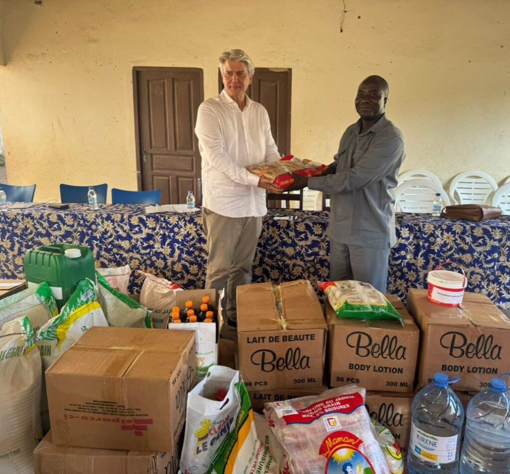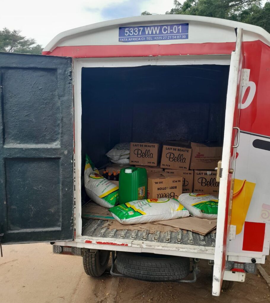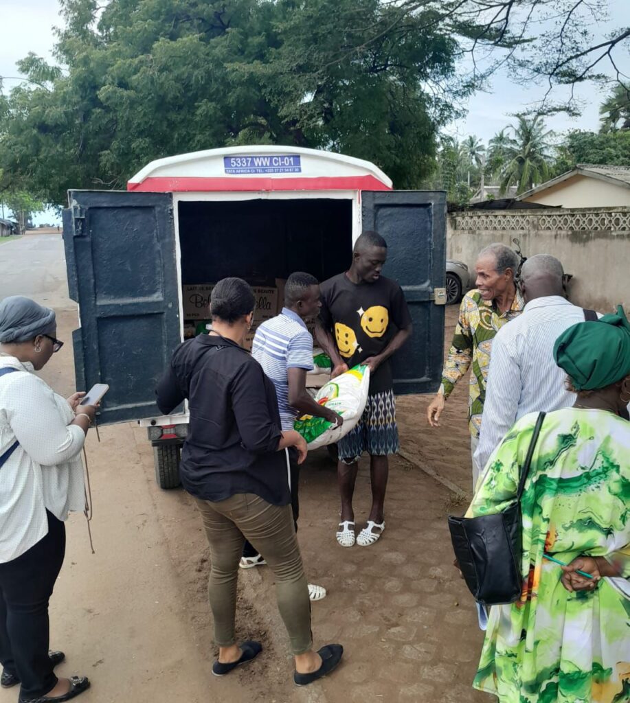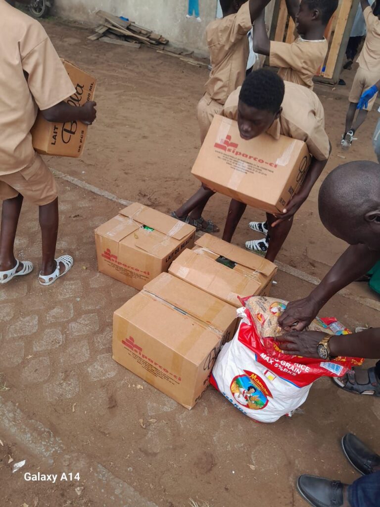 • De 14h45 à 16h45 : échanges enrichissants avec l’inspecteur, les directeurs et directrices de l’école, le doyen et président du COGES, M. Henry Martin. La journée s’est poursuivie par la remise de 700 kg de vivres, dont 500 Kg offerts par la Banque Alimentaire de Côte d’Ivoire, destinés à relancer la cantine scolaire, avant de se conclure par un chaleureux goûter solidaire offert par l’ONG Petites Mains Afrique partagé avec les enfants.